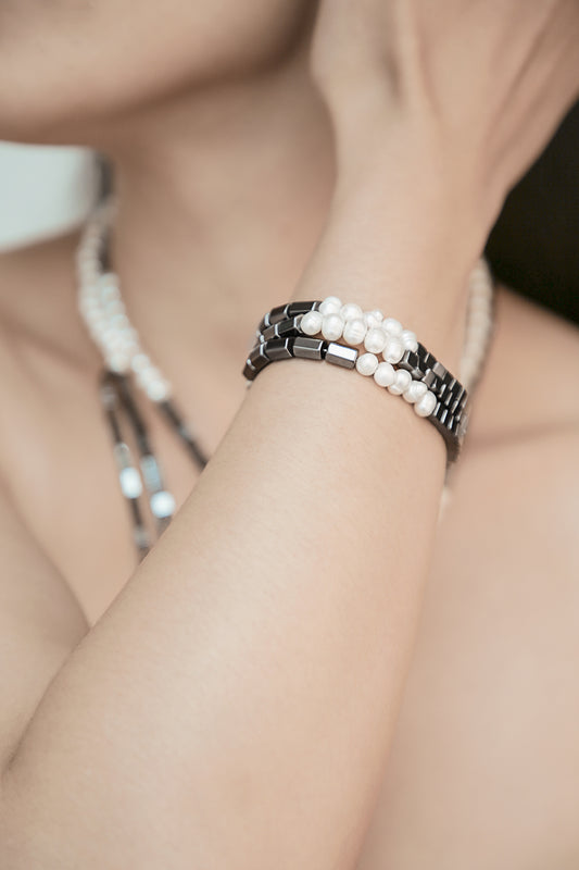 Quadrant Bracelet with Freshwater Pearls and Hematine