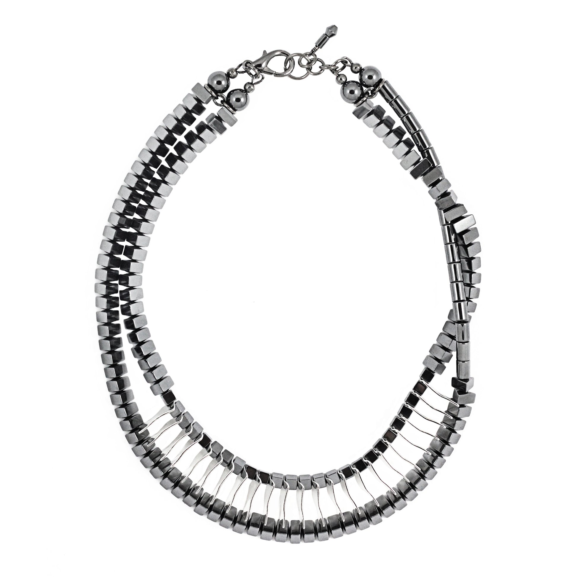 Dramatic, elegant and timeless monochrome statement necklace. Hematine and silverplated diamond shaped beads handstrung onto stainless steel wire creating a fluid and tactile 'liquid metal' effect.