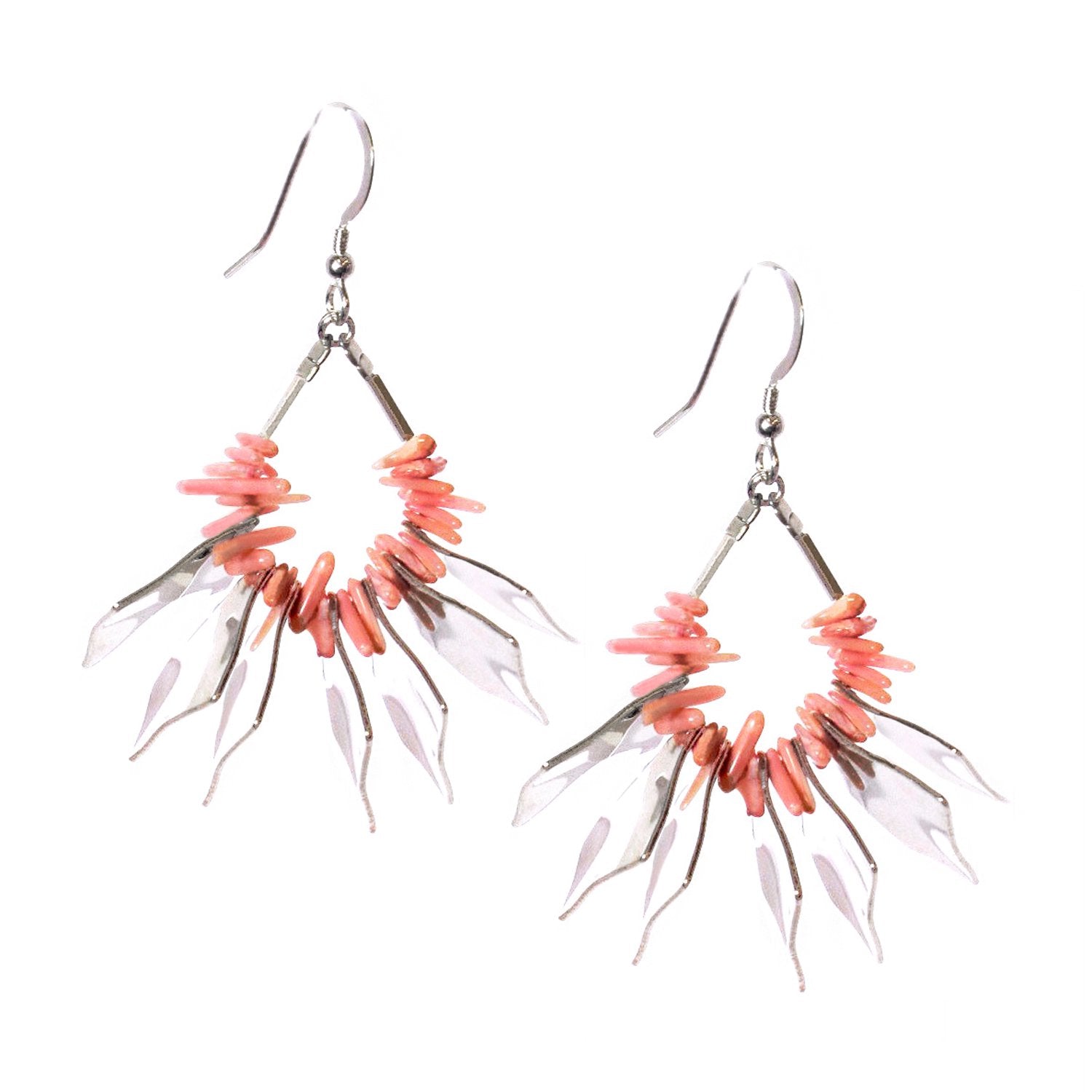 Intricately beaded earrings with silverplated diamond-shaped beads and pink sea-bamboo branches. Handstrung onto stainless-steel wire for a tactile and fluid quality.