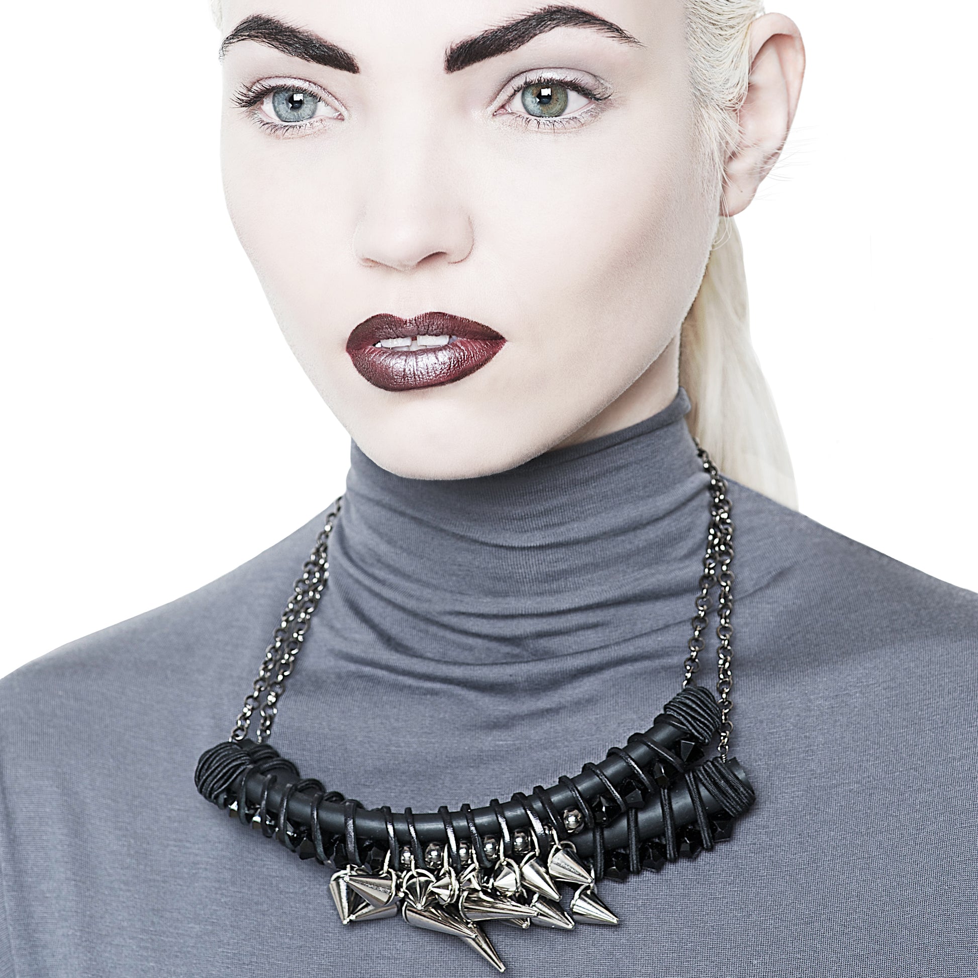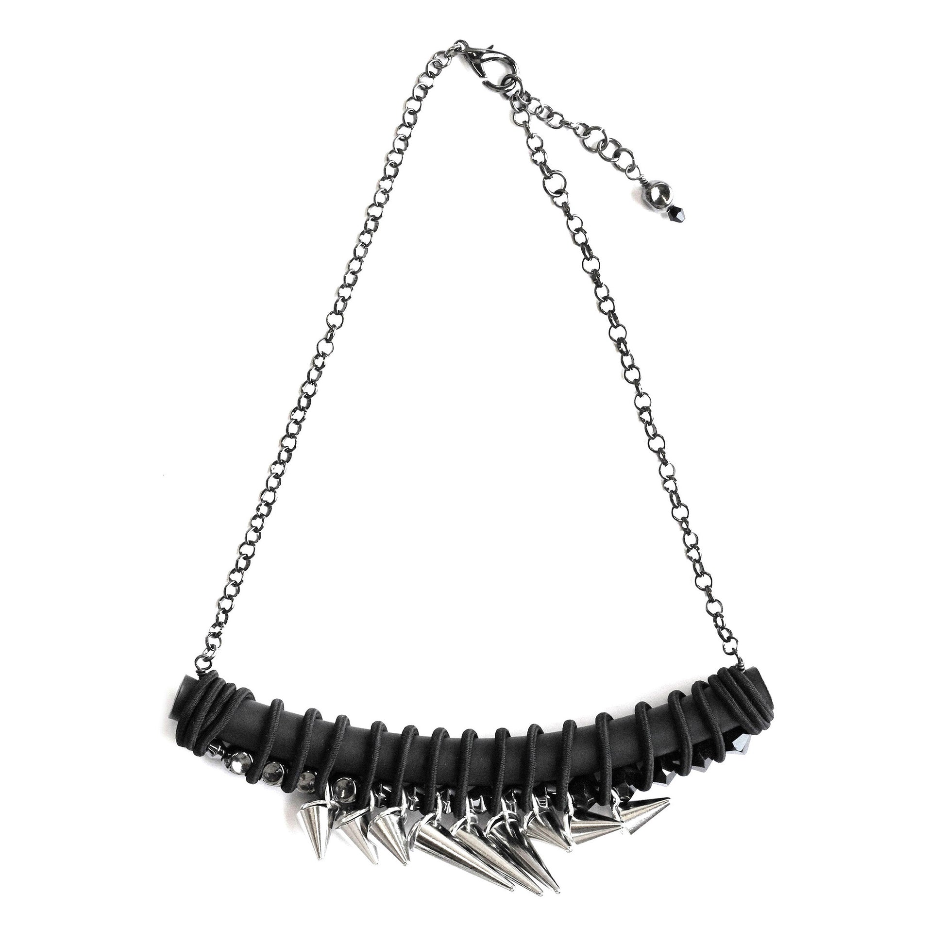 Black and silver chunky statement necklace with a touch of punk, that blends a mix of textures and materials together for a dramatic and unexpected edge.