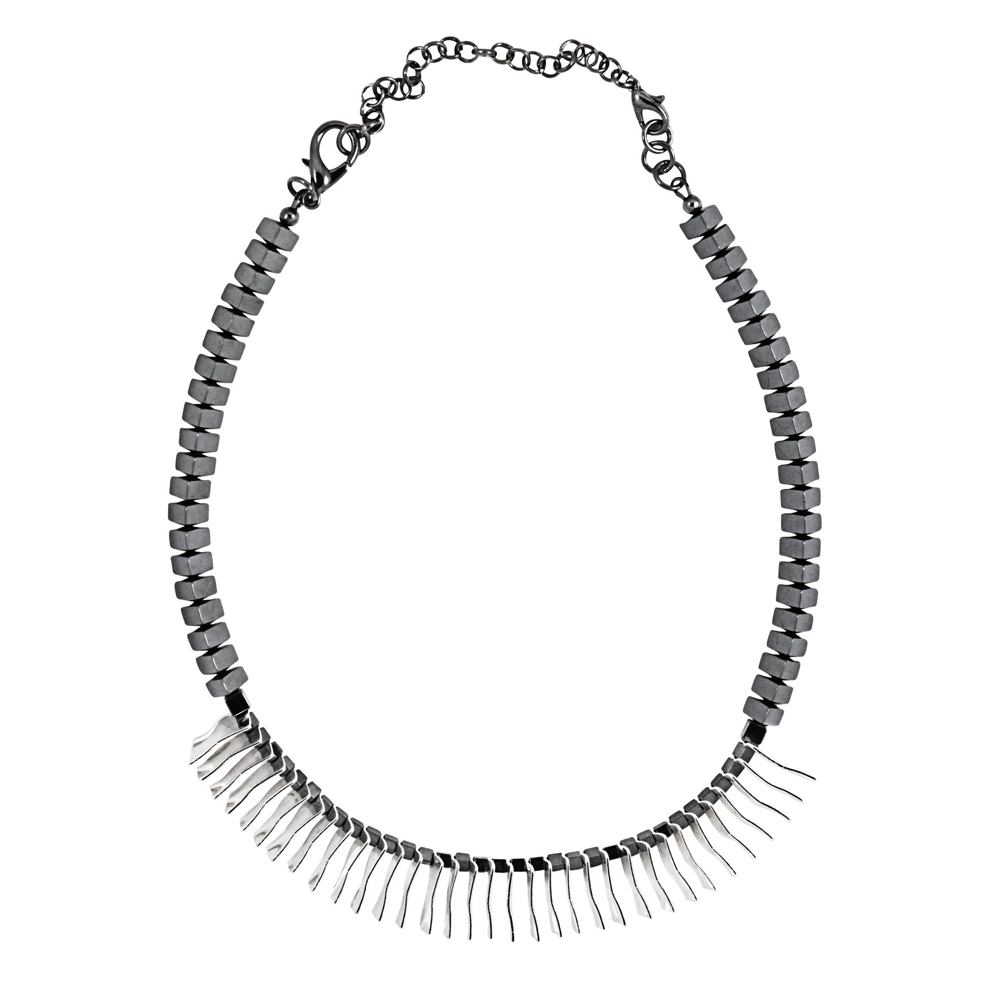 Dramatic, elegant and timeless monochrome statement necklace. Hematine and silverplated diamond shaped beads handstrung onto stainless steel wire creating a fluid and tactile 'liquid metal' effect.