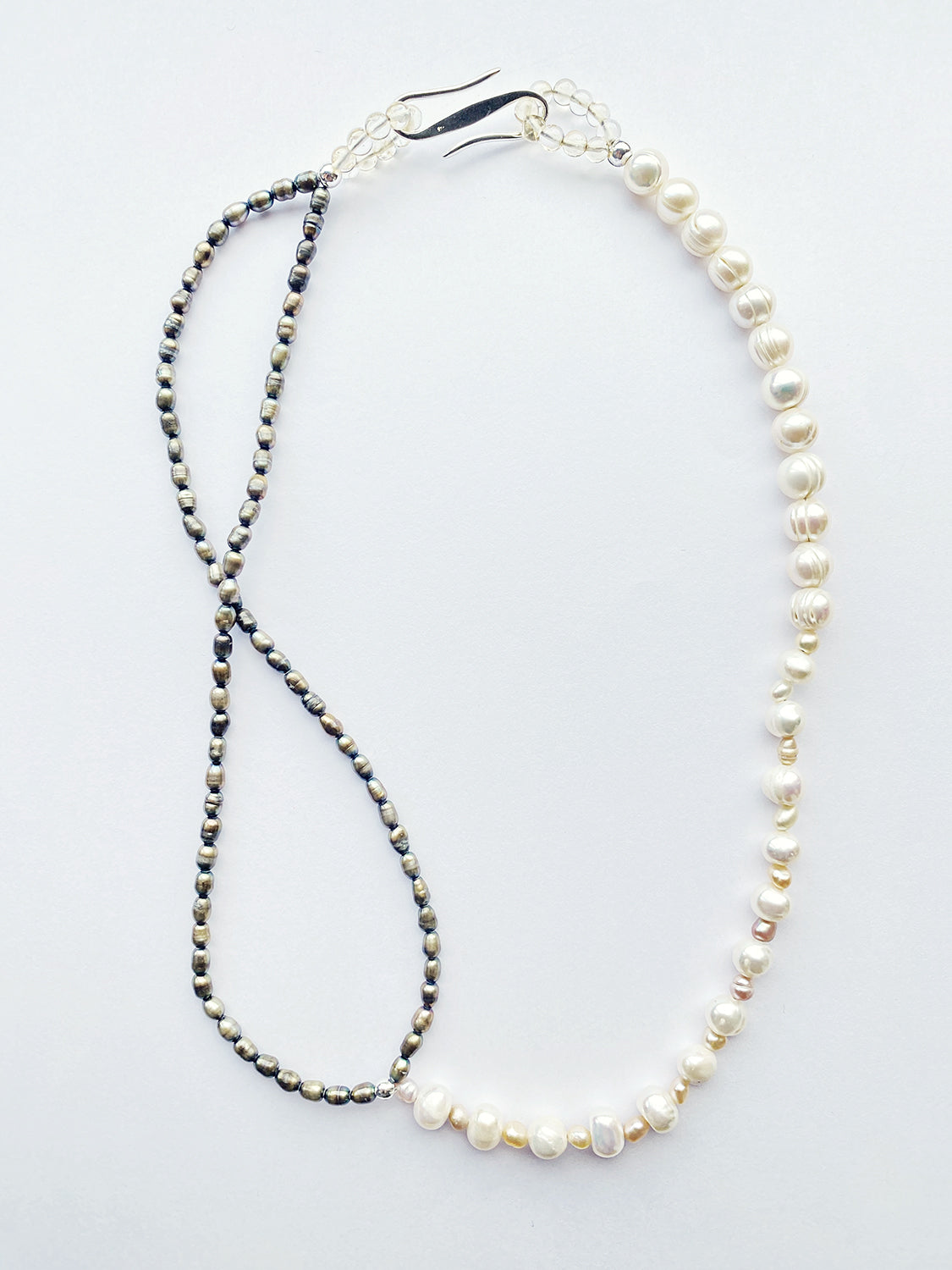Discover the allure of the Infinity Oasis necklace. A harmonious blend of green and ivory freshwater pearls gracefully intertwine to form a captivating asymmetrical design featuring the infinity curve. Features a looped gemstone fastening made from citrine beads and an S-shaped silver clasp.