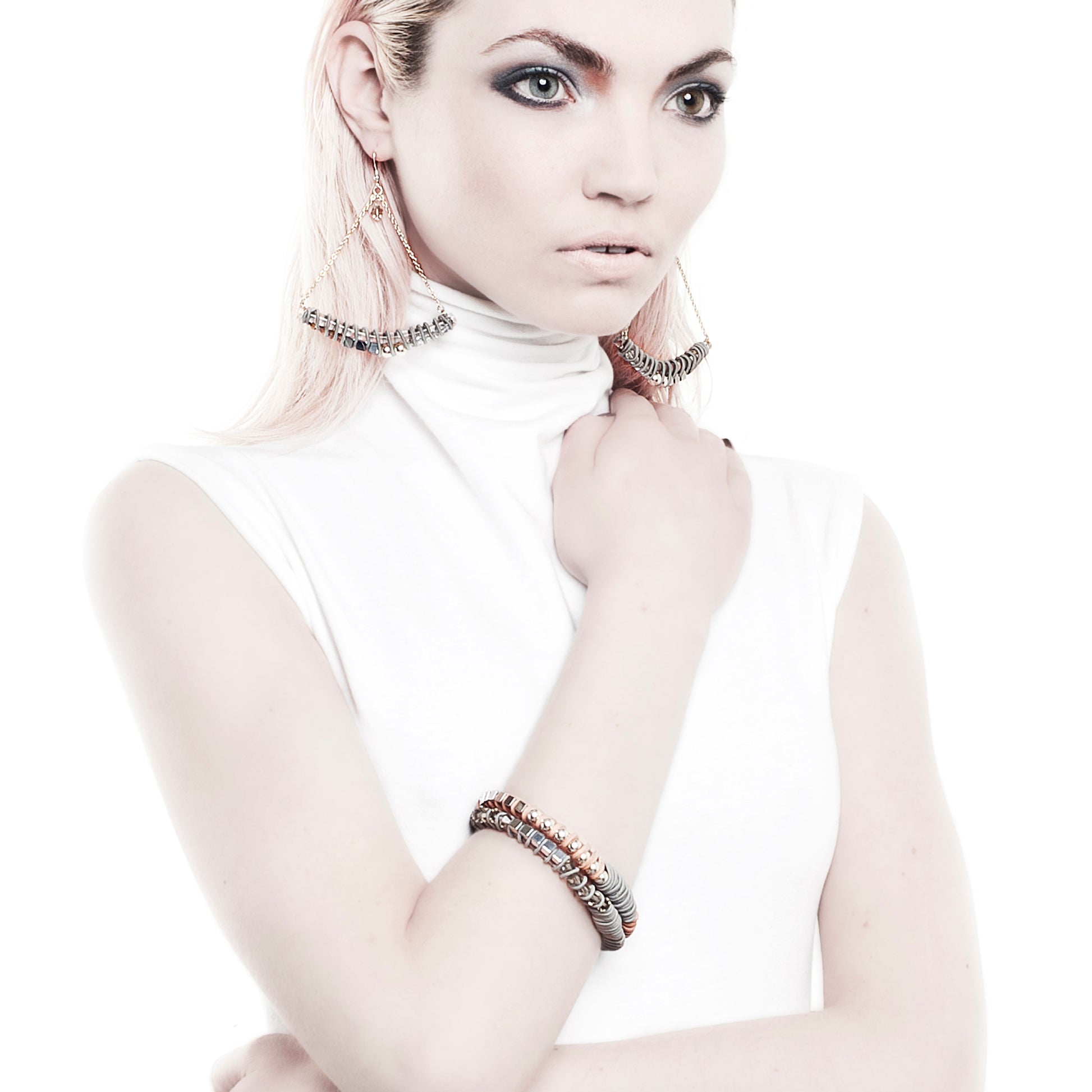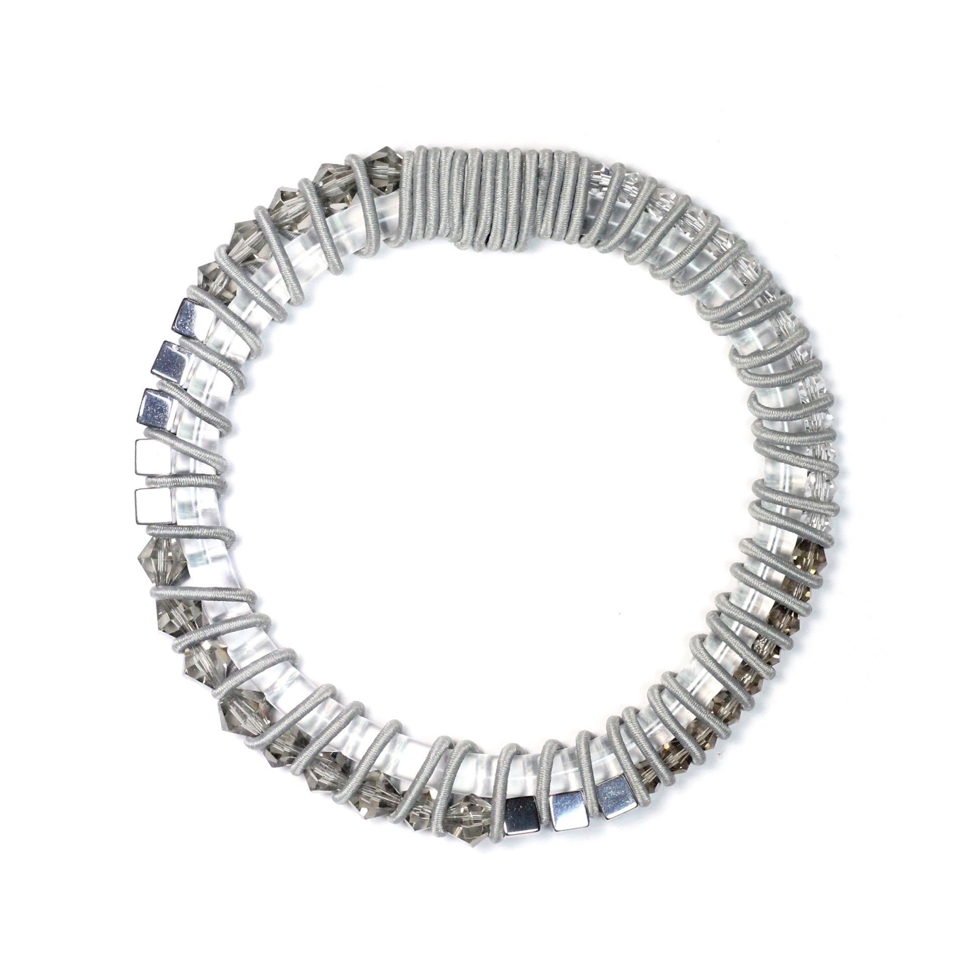 Textured PVC bangle, intricately wrapped with shock-cord elastic and embellished with glass and silver hematine beads. Wear on its own or layer up to create more of a statement.