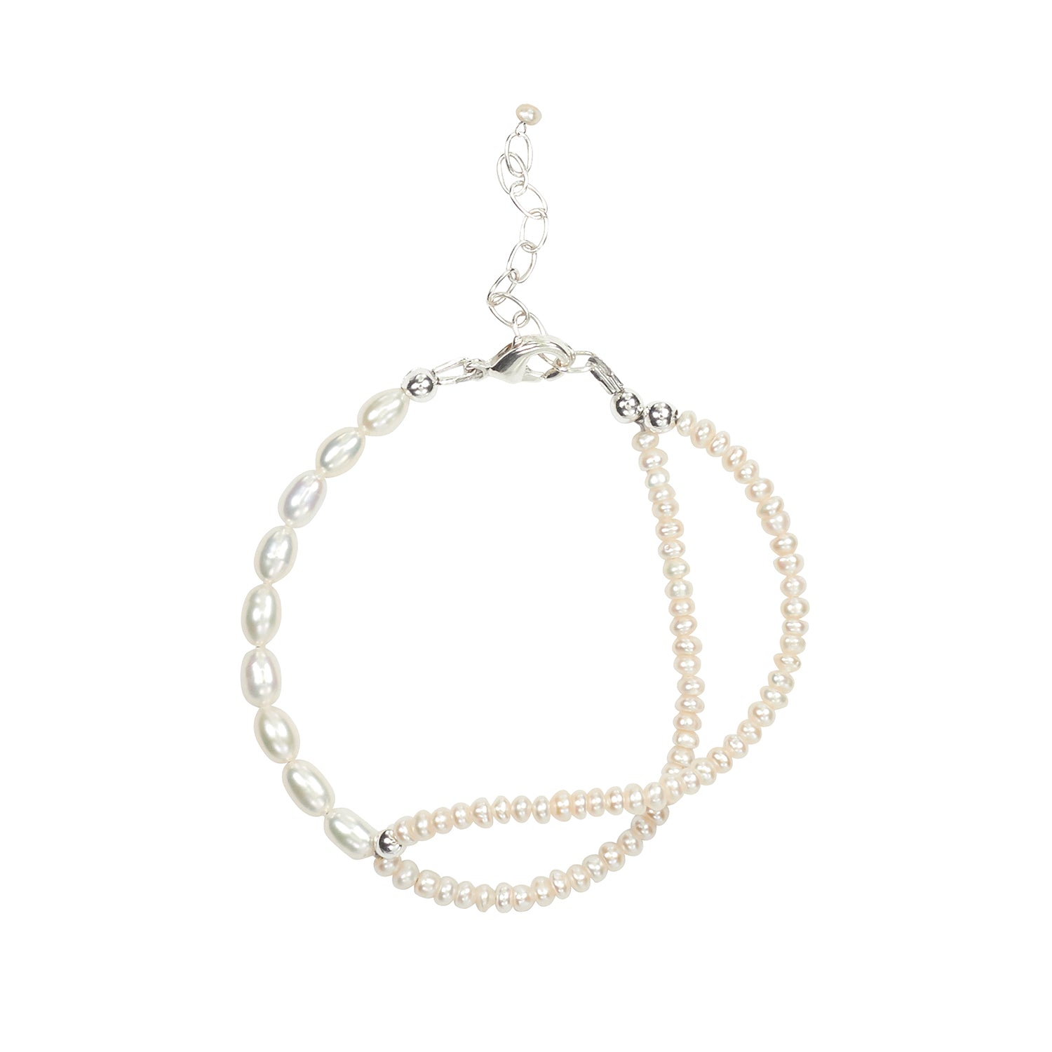 Asymmetric style bracelet with two different sized freshwater pearls - in rice and nugget shape.
