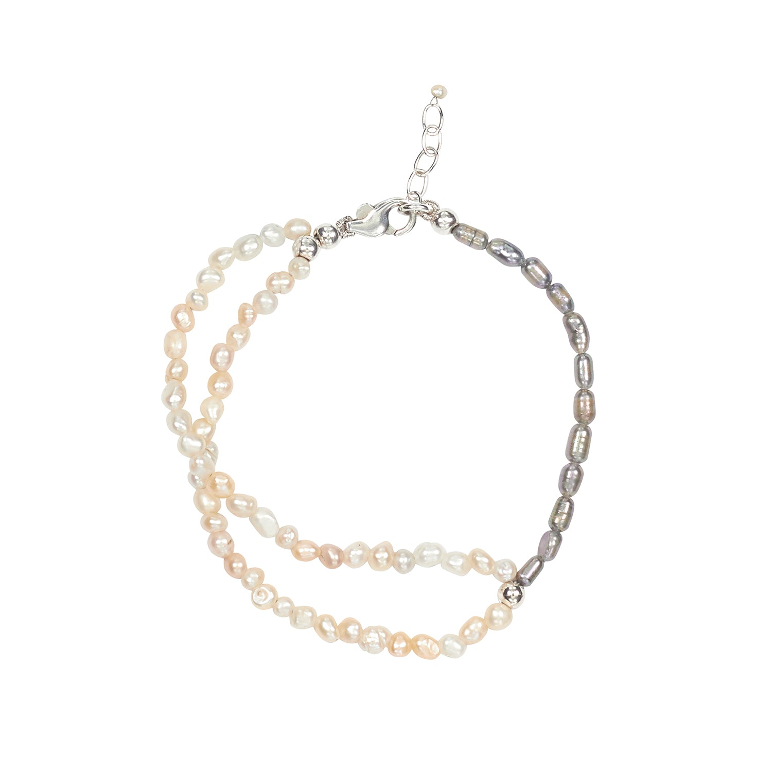 Asymmetric style bracelet with delicate freshwater rice pearls in natural/blush and grey/lilac. Bracelet can be worn with the loops twisted in the infinity shape.
