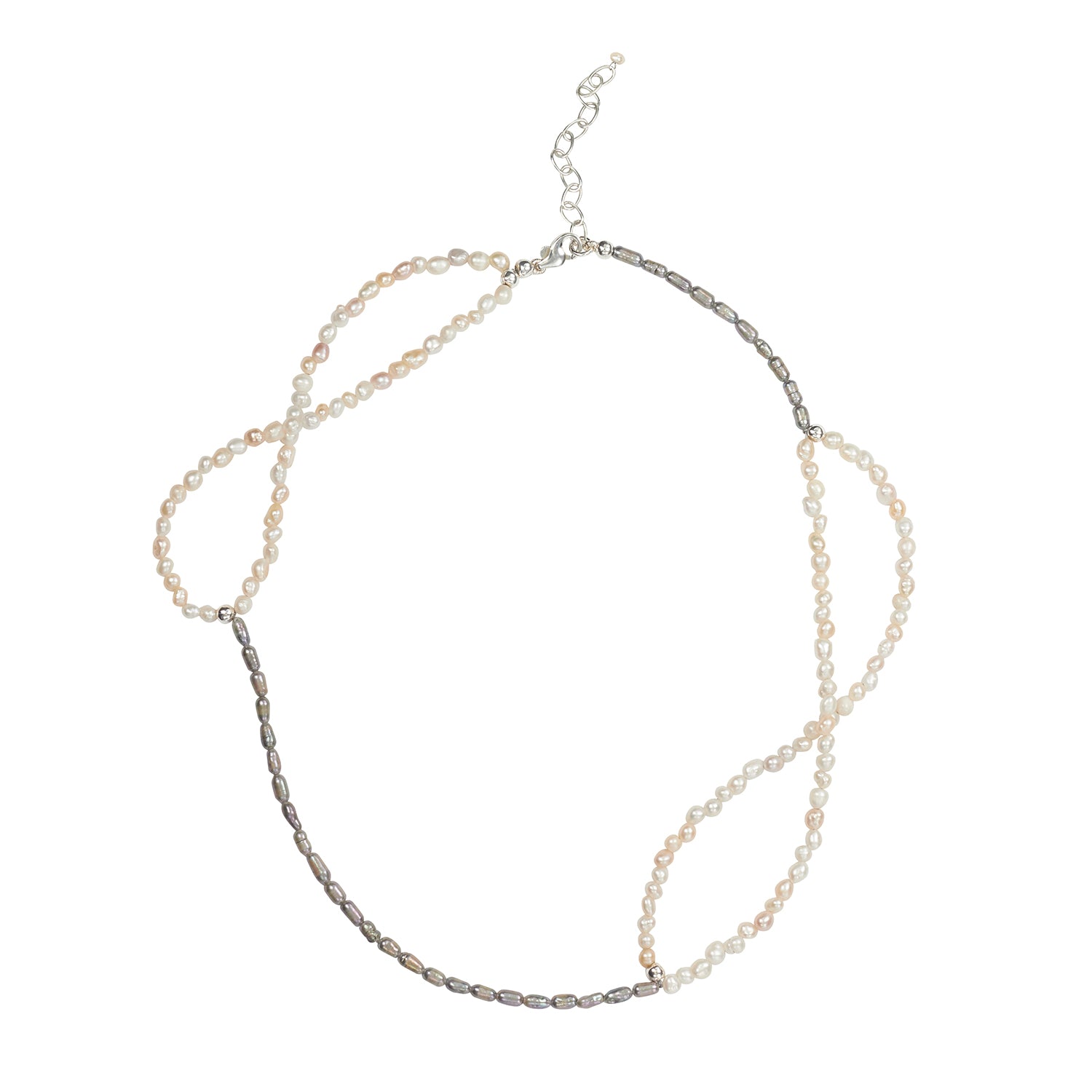 Multi-stranded asymmetric necklace with freshwater rice pearls in natural/blush and grey/lilac. Necklace can be worn with the loops twisted in the infinity shape.